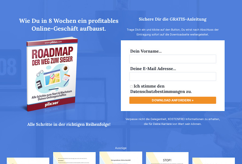 Kommt nun ein neuer Besucher auf Deine Landingpage und trägt sich in das Formular ein um den Ratgeber (PDF) zu erhalten, startet der plikker® Funnel.